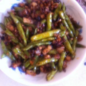 四季豆拜成小段,倒入油,油热把四季豆倒入锅里炸之