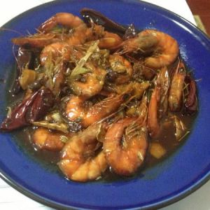下油,略有烟,下冰糖炒黄,下配料炒香,下虾把壳煎酥些,下生抽老抽,鸡精。中火炒。