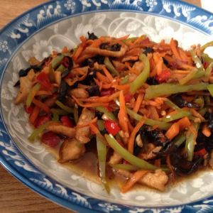 里脊 青椒 胡萝卜切丝,木耳泡发切丝