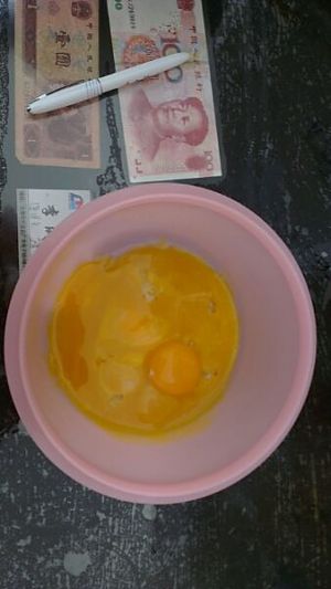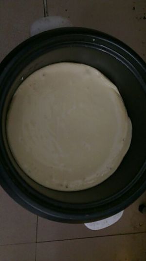 电饭煲预热,加入植物油,然后把面糊到入电饭锅里面,然后把内胆在桌上顿顿,把较大的气泡顿出来。