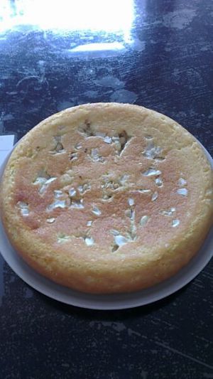 因为用电饭锅烤出来的蛋糕面上是白的,所以我又翻了一转再重复了一次,就变成这样了