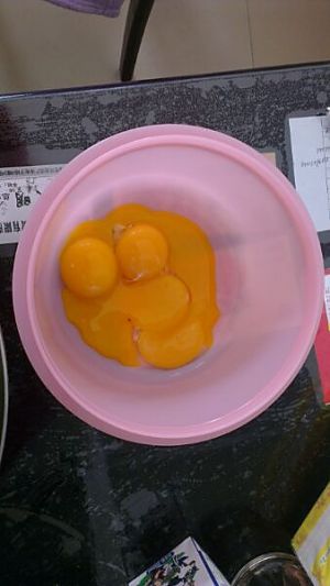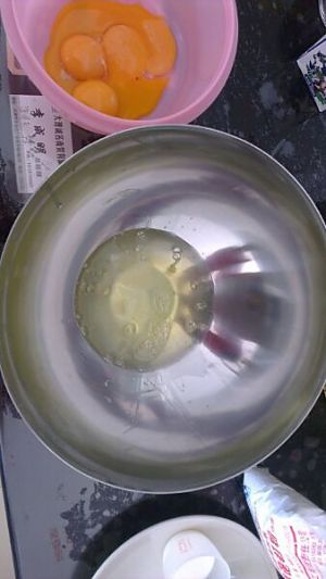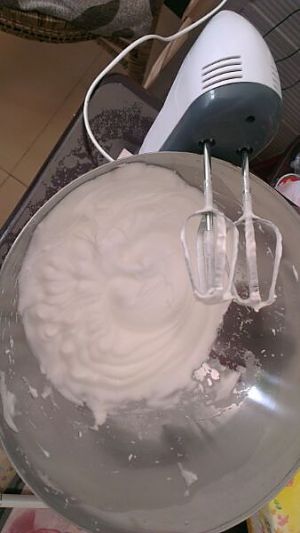打发蛋清,把白砂糖按照2.3.4茶匙的分量分别三次加入到蛋白里,每加一次白砂糖用打蛋器打半分钟,直到蛋白能倒过来不流淌的程度就大功告成了。没有准备打蛋器的朋友可以用三根筷子,不过那样比较慢,而且手会很酸。