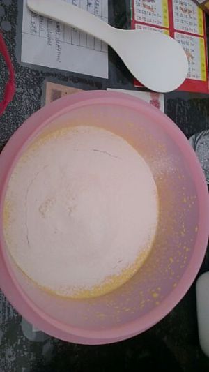 然后把面粉过筛到蛋黄糊里面,一定要过筛,不然很容易有颗粒。