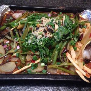 第二步:放进烤箱 鱼上涂油 我用刷子涂的 用手和刷子都可以的。上下火150度的样子15分钟 这个15分你要看着鱼哦,有些烤箱功率很大不停烤的话13分钟左右就行了。第三步:锅里热油下花椒、葱姜蒜、豆瓣、干辣椒、泡姜丝,泡椒炒香下素菜,我用的土豆和笋片,炒几下加水,加点芹菜。水开后淋在烤盘里的鱼身上,再烤10分钟。第四步:锅里热油,搁花椒和蒜末,鱼烤好了放点香菜,这个看个人喜好热油淋鱼上就ok啦