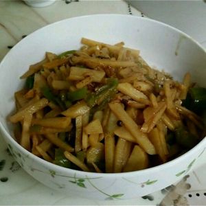 切好土豆丝和青椒丝少部分放入锅中,倒少点酱油,翻炒。