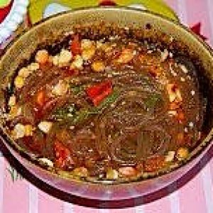 三分钟后关火,捞出锅内的带汤的粉,撒入炒熟的花生,黄豆,芝麻