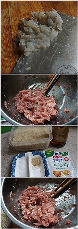 猪肉放绞肉机里绞碎,大虾挑去肠线,取出虾肉后剁碎,猪肉和虾肉混在一起,加一点蛋液,加一勺盐,白胡椒粉,生姜粉,白芝麻,香油调味,再加清水让肉馅吸水变得粘稠。基本跟饺子馅一个做法;