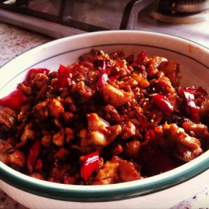腌制好的鸡肉和泡椒入锅、中火翻炒