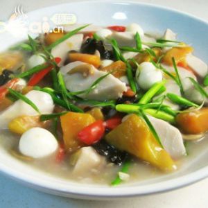 勾水淀粉,撒上一些切碎的蒜苗,翻炒一下出锅装盆。