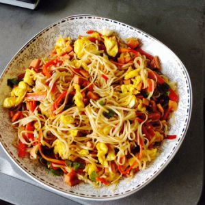 下油锅,先炒到,炒好后盛到一旁,在炒其他配菜,在下面条混炒,加入佐料,起锅。