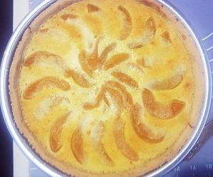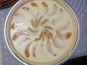 把黄桃切成月牙状,码放在派皮上。倒入阿帕雷酱汁。