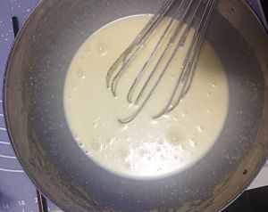 放入鲜奶油和牛奶,将材料完全拌匀。滴入香草精