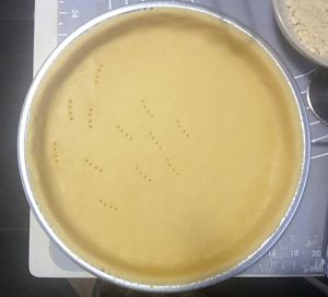 把静置好的面团用擀面杖擀成比模具稍大,3MM厚的面皮。将面皮铺进模具中,边转动模具边将面皮压进模具,然后将多余的部分用刮刀切除。
