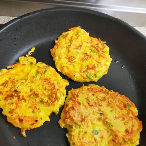 鸡蛋4个,胡萝卜土豆切丝混合双打,小香葱切成葱花。