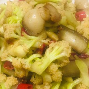 将回锅肉煸炒出部分油脂,然后放红椒、蒜子一起翻炒;