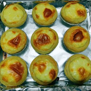 葡挞表面形成焦糖色黑点挞皮变成金黄色,即可出炉!
