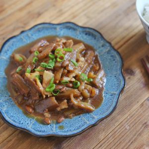 加入五花肉进行翻炒,让汤汁基本裹匀