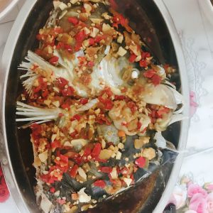 将调料浇到鱼头上面,最后淋上植物油,上锅蒸二十分钟