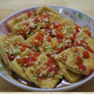将3中的剁椒蒜泥汁浇均匀的浇在豆腐上。最后将锅底剩余的底油加热淋在浇汁的豆腐上即可。(PS:炸好的豆腐摆盘时最好用小刀划上口子这样浇汁后容易入味。)