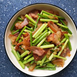 放入蒜苔加入一丁点盐炒至蒜苔稍变色就熟啦,起锅装盘,(腊肉是咸的所以不能加太多盐)