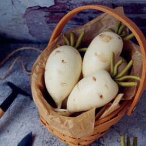 可可粉用一丁点水调开,用牙签沾点可可液,在白萝卜身上划出一条条痕