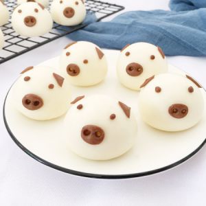 白色面团刷一点水,装上耳朵、眼睛,鼻子用筷子在鼻子两侧戳两个洞。
