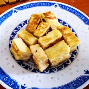 锅烧热,涂上一层黄油,放入裹好蛋液的馒头片,煎至两面金黄。
