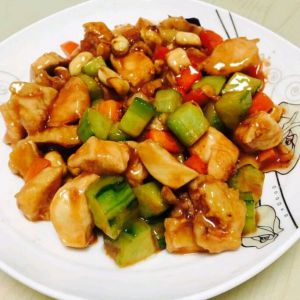 7放入黄瓜块,炒好的花生米,翻炒几下收汁,关火即可出锅啦~