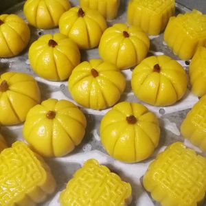 和好的面团分成25克的小剂子,芋泥也分成25克。南瓜面团象包汤圆一样把芋泥包好滚圆。用牙签或刮板在上面压米字,用枸杞做南瓜柄。