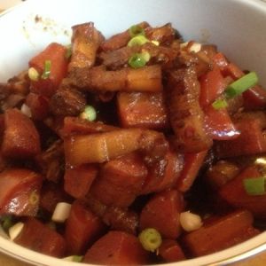 待肥肉油炸出来得差不多的时候再捞出肉块放入姜蒜爆香后再次放入肉块入味后放入胡萝卜炒一下
