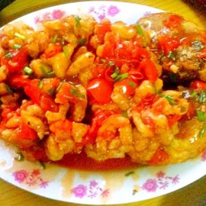 留锅底油,炒香姜、蒜末下蕃茄酱炒出红油再下蕃茄丁炒熟,倒入糖醋水淀粉,最后下葱末、香油出锅。鱼摆盘,把糖醋汁浇到鱼上。