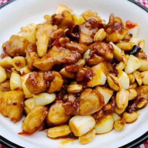 大火收汁,待还有少许料汁的时候加入葱段,翻炒一下(此处能颠勺最好)继续收汁,(注意:葱段放太早就会煮烂,太晚又会辛辣不入味),汤汁都收到差不多了加入麻辣花生快速翻炒,关火出锅。