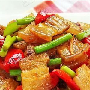炒锅入放油烧热,加入五花肉片煎一会,将油煎出一部分,煎到肉片变得透明。
