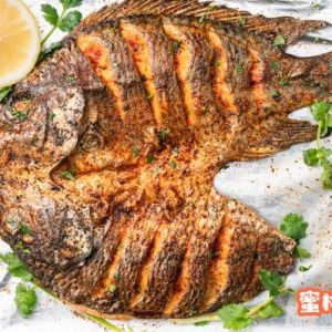 腌制好的罗非鱼取出,用厨房纸吸干水分,然后往鱼肉表面刷一层食用油,撒上花椒粉、孜然粉、盐和辣椒粉,再在鱼皮表面刷一层食用油