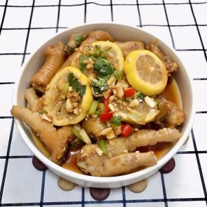 鸡爪沥干水分把酱汁倒入,放入蒜蓉、香菜、柠檬片(2个)、朝天椒搅拌均匀放入冰箱冷藏一天。