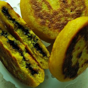 同包黑芝麻馅的一样包,包好后一面粘上白芝麻下锅煎熟即可。