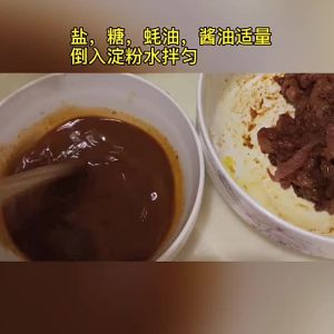 肉丝用适量的盐,酱油,油,十三香,淀粉拌匀,再调适量的淀粉水和适量的盐,糖,十三香,酱油,蚝油搅拌均匀。