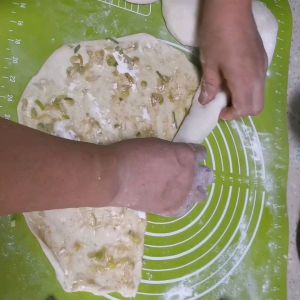 拌好后,往饼上撒少许面粉,卷成圆柱状,具体的步骤我上传到封面的小视频上了,大家可以参考一下。