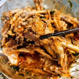 煮好的鸡捞出来放入提前冻好的冰水中等待完全凉透定型 然后拿出来撕成小块装入碗中