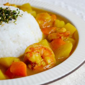 土豆和胡萝卜分别滚刀切块,大虾去掉下线和皮,只留下肉肉部分。