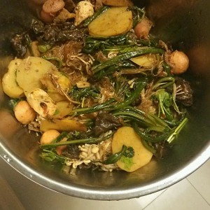 锅内放油,放入干辣椒和麻椒,闻到香味后,倒入火锅底料(注意,一定是用那种块状的火锅料),将底料炒散后,再按顺序倒入:土豆、鱼丸虾丸等丸类,翻炒均匀后,再下入牛肉片继续翻炒,等牛肉稍稍变色时,再下入木耳、金针菇、油麦菜,加入少许醋、糖、盐调味,最后加入粉丝吸收多余的汤汁后,就可以出锅了