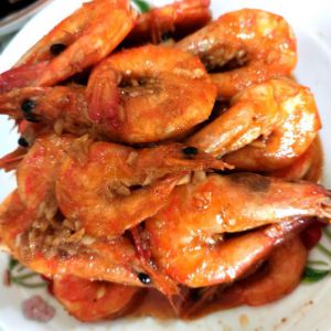 锅里留少量油,放入蒜末,加点耗油,炒香后加入一点糖放入两小袋番茄酱(快餐那种小包装),炒一下放入虾,加适量盐,就可以出锅了。