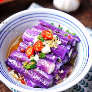 熟后把茄子大家可以看下,色泽还是水灵灵的紫特好看,蒸好的茄子夹出放凉,控干水摆盘备用。很多人说茄子要蒸十几分钟,其实判断了的茄子熟透没用筷子插一下就知道了,筷子可以轻易插入就代表熟了,不需要蒸太久,这种凉拌的太软会比较不爽口