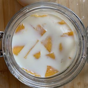 牛奶隔碗加热,泡好的吉利丁片放进去,融化即可。