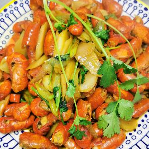 炒至龙虾变红,下料酒(稍多点,不用加水了)继续翻炒。