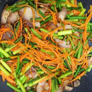 蒜苔洗净沥干水份,腊肉切片,胡萝卜切丝备用。