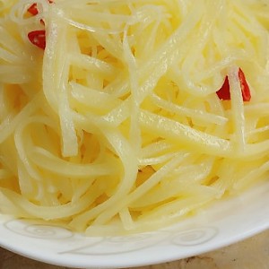 放入土豆丝,翻炒1分钟左右,放入白醋翻炒几下再放入盐,继续翻炒,炒2-3分钟左右,放入鸡精关火盛出装盘即可