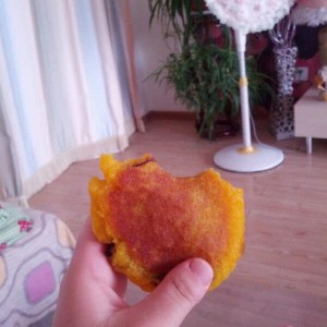 手上放少许油,抓适量面团,看你想做的饼大小了。在手心压成饼状,放入豆沙馅,爱吃甜的可以多放点,然后再团圆压扁。大功告成啦。