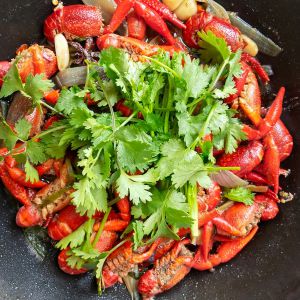 倒入油炒过的小龙虾,加调味料。依次:黄酒,生抽,香醋,蚝油,辣椒酱,少许鸡精,白糖,盐。