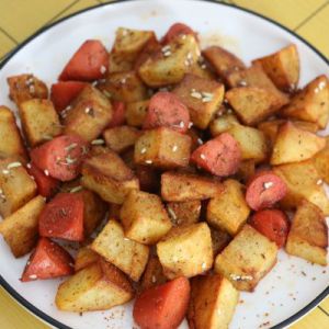 土豆炒至焦黄,放入火腿肠丁翻炒。